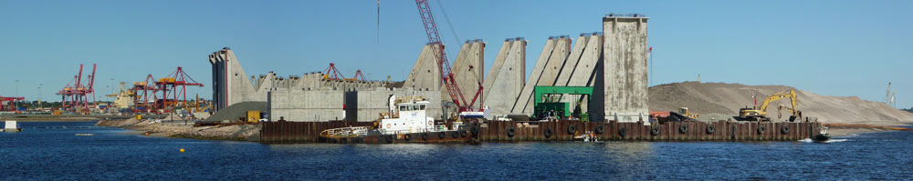 In the construction of the terminal some 7.8 million cubic metres of sand will be dredged and 60 hectares of land created. This has already commenced, as has the construction and placement of massive concrete counterforts that will be sunk along the edge of the new land to provide a quay line suitable for the berthing of container ships.