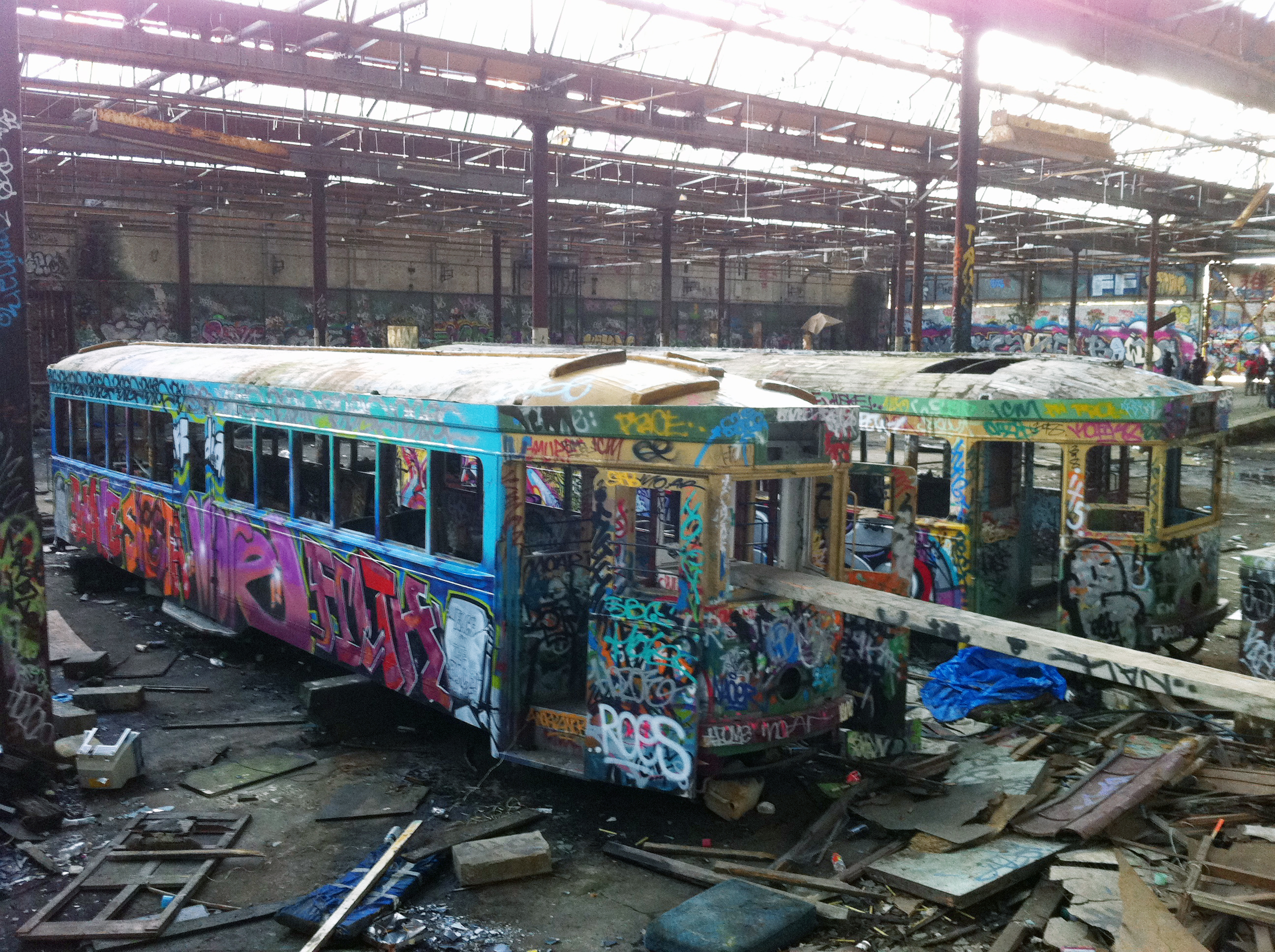 Quickly I parked my bike, rolled under the gate and made my way, iPhone in hand, to the open doors. The first shed was empty save for the the accumulated detritus of another era, but certainly nothing of value. Skirting around the edge of the shed on an eleveated walkway, I noticed a young woman. She was standing in an opening that seemed to lead to another large room. Making a little noise to mark my approach, so as not to startle her with a sudden appearance, she seemed completely disinterested, her attention drawn to something in the next room. Stepping past her I looked for the first time at the tram graveyard, then groups of people milling around in various parts of a vast and junk strewn space. Everything was wildly decorated in graffiti. The old corridor trams no exception.