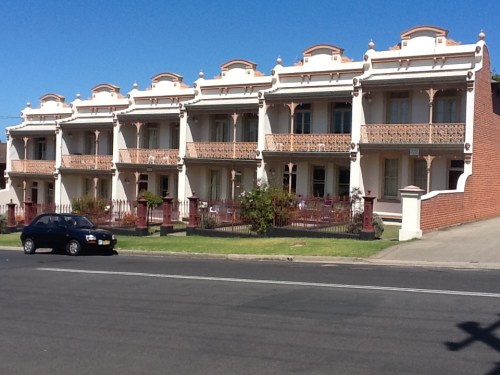 Year ago, when I worked as a consultant with the Country Areas Program I flew into Merimbula before heading up the coast to Central Tilba for a school visit. Remembering the colour of the ocean along this stretch on the NSW south coast, the Saphire Coast, I was keen to head back to Merimbula. I wasn’t disappointed, but being the summer holiday period I soon headed inland again to escape the teaming caravan parks and look for a quieter camping spot. This wasn’t before I had the most curious architectural encounter. Sitting on a hillside in Merimbula is this extraordinary row of terrace houses.