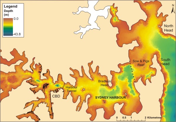 The truth is I wasn’t sure. I know that Anzac bridge has a maximum clearance of 28.5 metres above high water and I know Sydney Harbour is deep in places but it’s a drowned river valley, Ria coastline, and in a practical sense I realise that parts of the harbour are quite shallow Bays like Blackwattle Bay, I reasoned, have been so heavily modified and polluted with industrial sediments, I wasn’t sure, but I thought the maximum depths were probably 6 to 10 metres. Later I confirmed, with a visit to the “>OzCoasts website, that the . . . seabed morphology of Sydney Harbour is complex and irregular with a series of deep ‘holes’ up to 45 m deep, and shoals where the water depth can be less than 3 m.
