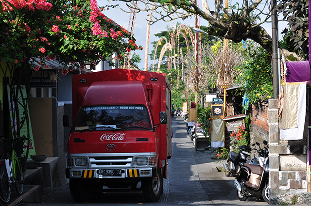 Kajeng is narrow, above it the airspace dominated by over-arching penyor and a tangle of electricity and communications cables lane. Just up the lane a bright red Coca-Cola delivery truck almost seemed in place.