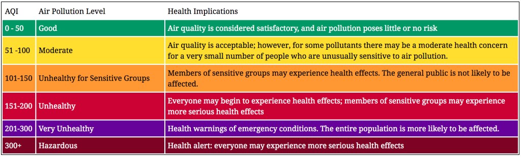 The AQI shown, PM2.5, is a measure of the occurrence of particles or droplets in the air with a size of 2.5 microns (2.5 μm) or less per cubic metre. PM refers to Particulate Matter. A micron is a unit of measurement for distance. There are about 25,000 microns2.5 cms approximately an inch. They are very small particles that can be inhaled deeply into the lungs causing harmful effects.