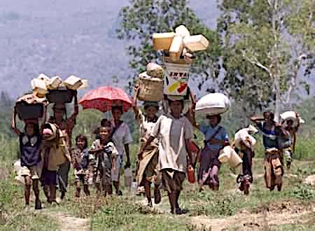 Original caption: “East Timorese refugees carry their belongings as they cross the border back into their homeland near the town of Memo Tuesday. Thousands of East Timorese, who were forcibly deported to West Timor by pro-Jakarta authorities following a vote for East Timor’s independence from Indonesia, trickled across the border after walking in intense heat for hours, with at least five people reported dead during the trek. (Jason Reed/Reuters)”