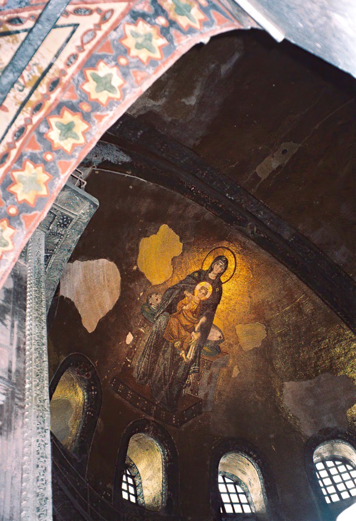 His mind’s image flicked again. He drifted through the massive central space drawn upwards past eight calligraphic roundels, Islamic additions. Flowing into the eastern semi-dome apse he embraced and venerated the mosaic of the Theotokos holding the young Christ.
