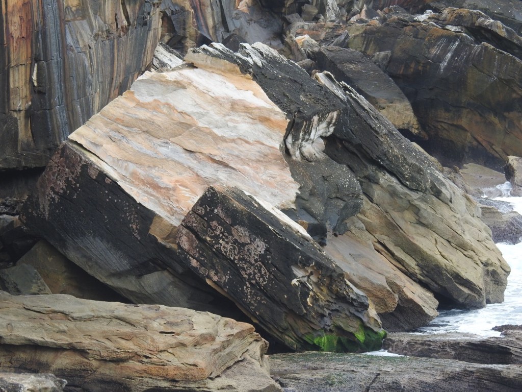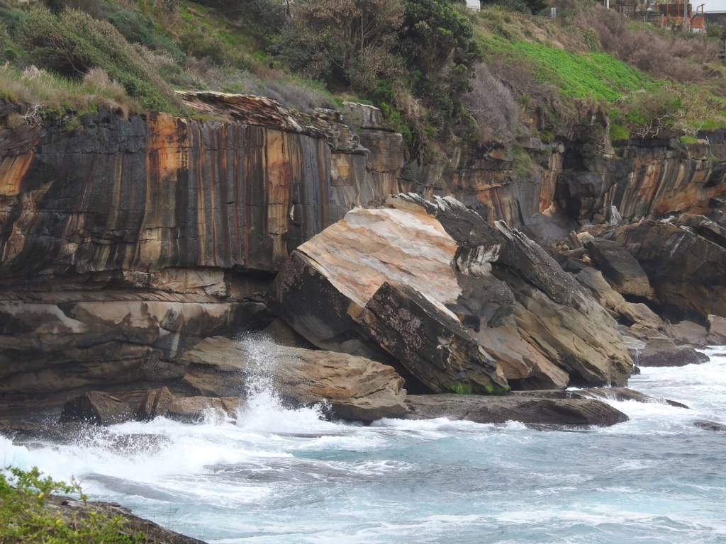 The stone is referred to as Hawkesbury sandstone, a very hard rock, often with vertical jointing which, combined with coastal erosion causes large blocks to break away forming vertical cliffs with boulders at the base.