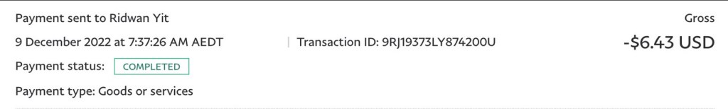 Here are Ridwan’s PayPal details. I’ve taken these from a trial we did. I sent him what was Rp100000 and it converted to USD6.43, on the day.
