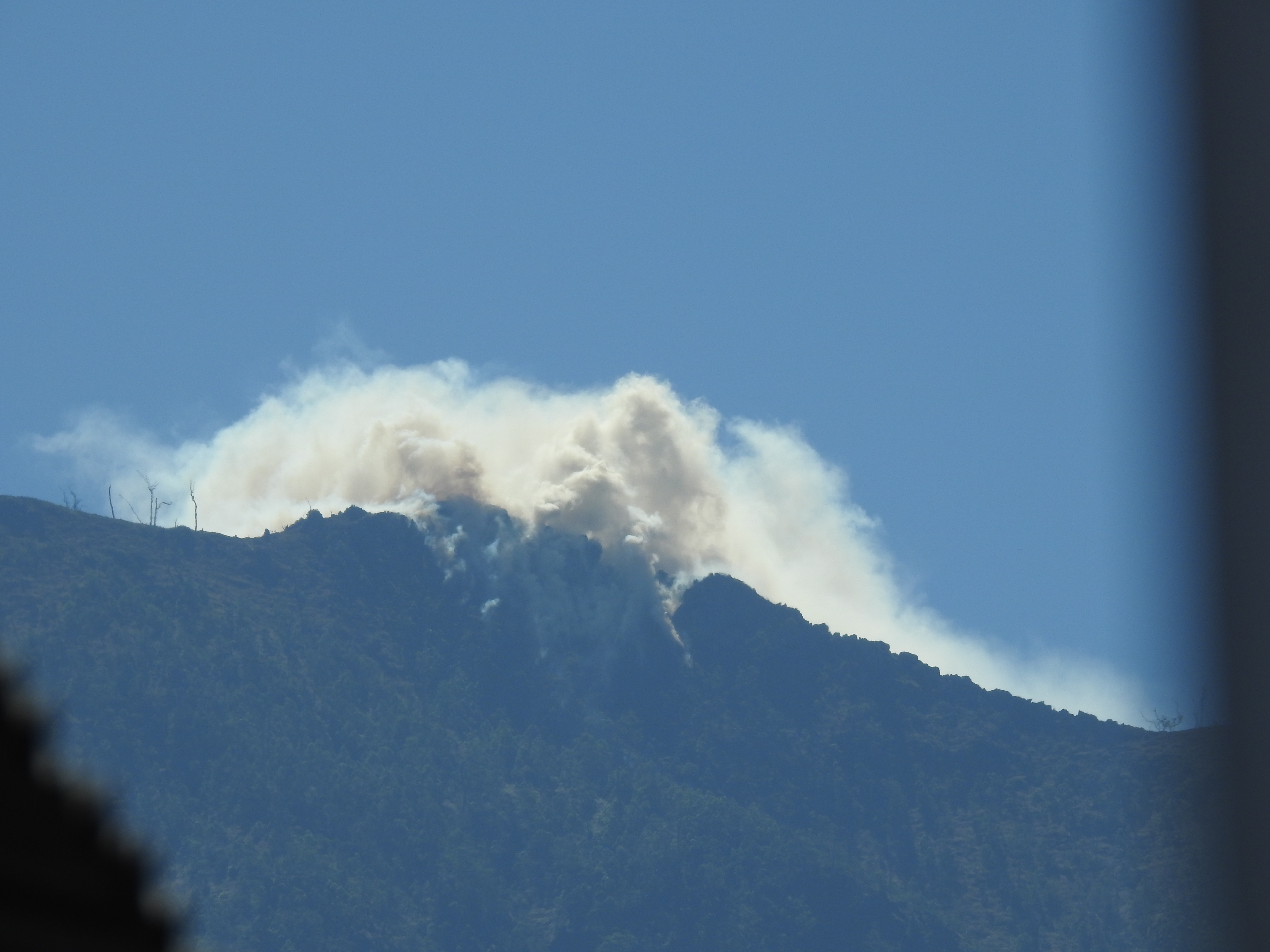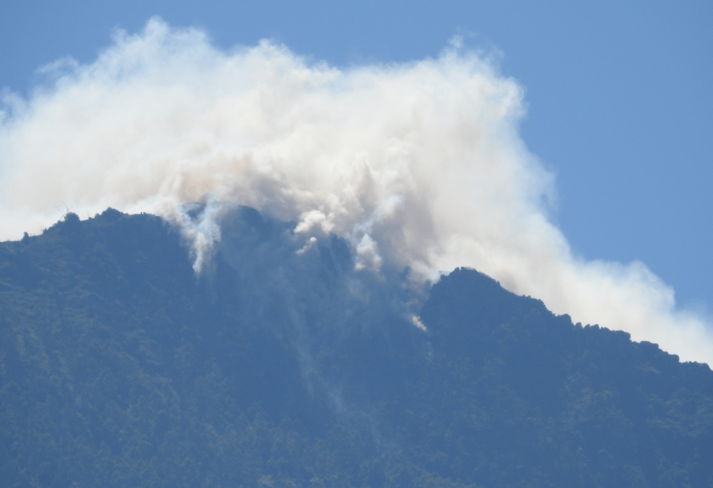 Directly ahead wildfire leapt up steep gullies towards Foho Madanaga’s towering prominence. Strong winds from Australia’s dry heart drove raging flames now lost in billowing white smoke. Intense combustion, and mere days after the dry season’s onset. The blaze presented no threat to my journey as the tilted bare rocky strata at the summit ensured certain extinction.
