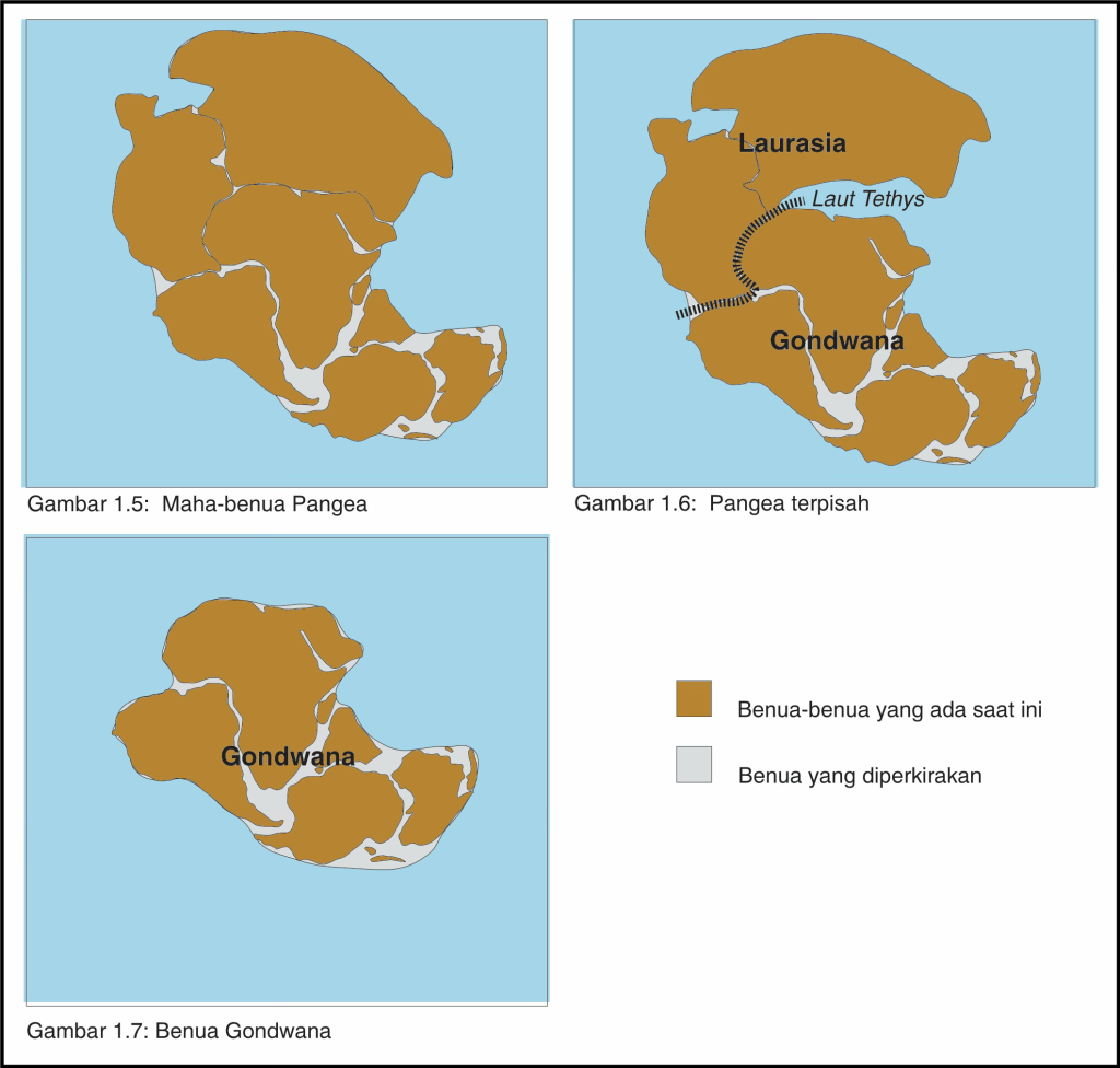 Pada saat ini hanya ada satu mahabenua yang sangat besar di dunia, yang dikenal dengan sebutan Pangaea. Peta dalam Gambar 1.5 menunjukkan mahabenua Pangaea ini. Beberapa plato yang ada di Australia Barat merupakan bagian dari benua tersebut. Bagian- bagian ini di Australia tetap stabil selama jutaan tahun dan tidak banyak terpengaruh oleh gerakan-gerakan bumi. Di sini gempa bumi jarang terjadi dan beberapa bentuk batu ada yang berumur kira-kira 1.000 juta tahun. Beberapa dari batu tua ini yang muncul karena adanya erosi, penuh dengan endapan emas dan intan.