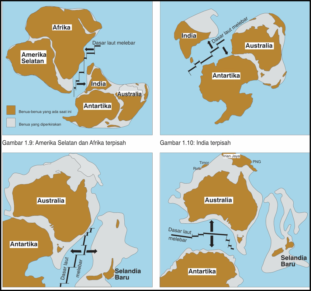 Kira-kira 150 juta tahun yang lalu benua besar Gondwana mulai terpecah. Pertama-tama, Afrika dan Amerika selatan terpisah dengan India, Antartika dan Australia. Hal ini tampak dalam Gambar 1.10.