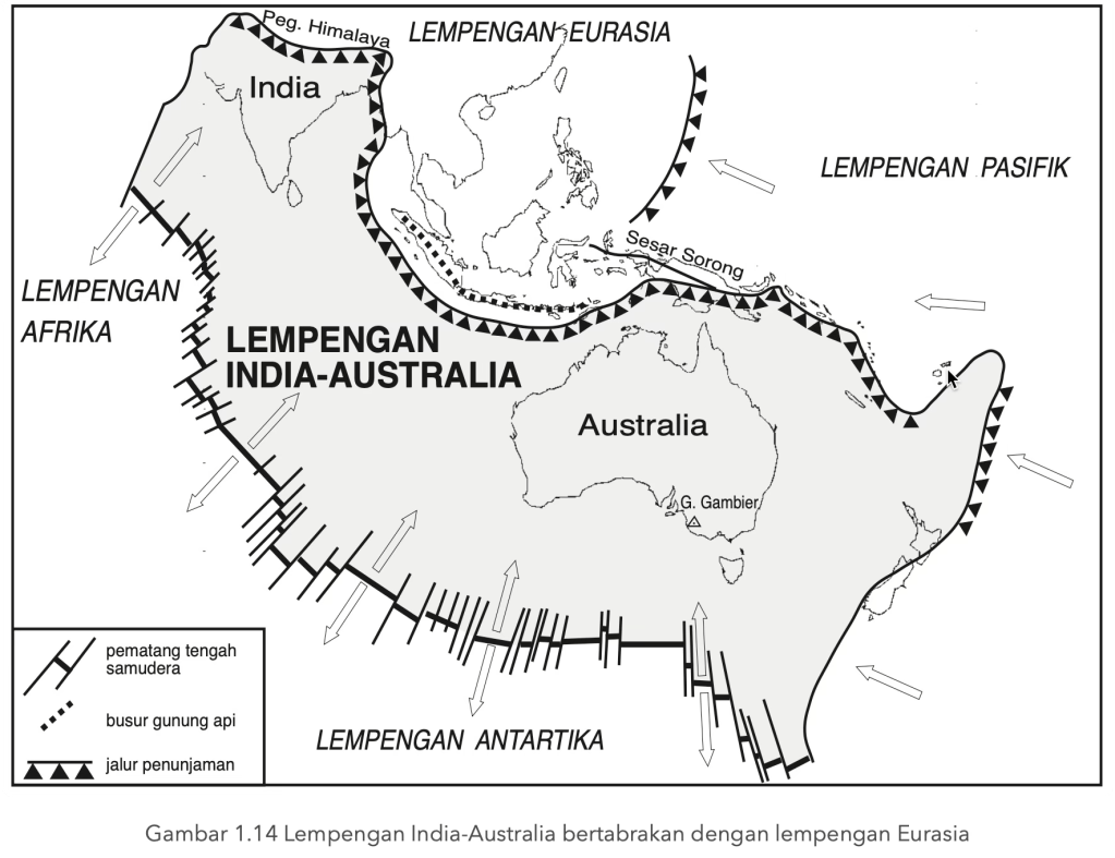 Terdapat pematang tengah samudera di antara Australia dan Antartika. Pematang ini melebar sebesar 6 sampai dengan 7,5 sentimeter per tahun. Pelebaran dasar samudera ini mendorong lempengan India-Australia ke arah utara sehingga bertabrakan dengan lempengan Eurasia. Tabrakan ini dimulai sekitar 25 juta tahun yang lalu dan terus berlanjut hingga sekarang. Lempengan India-Australia sedang didorong ke bawah lempengan Eurasia. Proses ini disebut penunjaman . Tabrakan kedua lempengan tersebut membentuk Pegunungan Himalaya, yakni busur gunung api di Indonesia, parit Sunda dan Jawa serta tanah tinggi Nugini. Australia bagian utara telah didorong ke arah bawah sehingga membentuk Teluk Carpentaria dan Laut Timor serta Laut Arafura. Tabrakan lempengan-lempengan bumi tersebut tampak dalam Gambar 1.14.