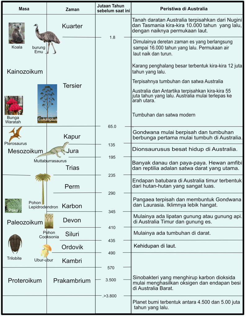 Bentang alam Australia terbentuk selama jutaan tahun. Dulunya bentang alam tersebut tidak selalu seperti sekarang. Iklim Australia juga telah berubah. Demikian juga dengan tumbuhan dan satwa yang menempati benua tersebut. Cerita tentang bagaimana Australia memperoleh bentuknya yang sekarang ini merupakan cerita panjang dan menarik, yang dimulai dari zaman prasejarah. Tabel dalam Gambar 1.4 merupakan ringkasan dari beberapa peristiwa penting pada zaman prasejarah Australia.
