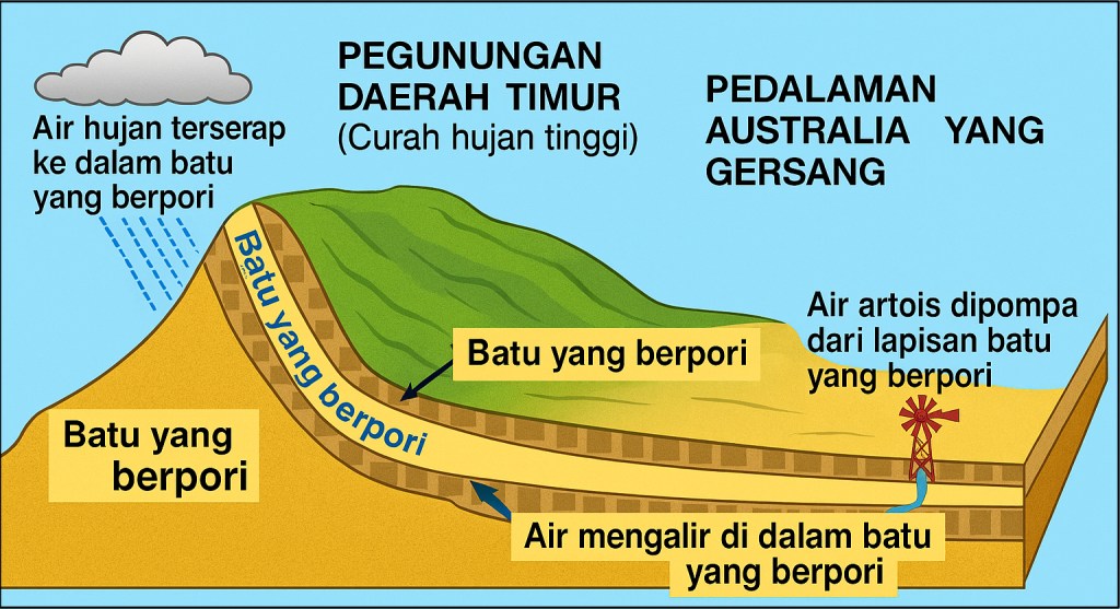 Sekarang ini air tersebut tersimpan di bawah tanah dan dapat dipompa ke luar untuk menghidupi domba dan ternak. Seringkali, airnya dapat bertambah apabila terdapat hujan di sepanjang Pegunungan Sebelah Timur . Diagram dalam Gambar 1.8 menggambarkan bagaimana hal ini semua terjadi.
