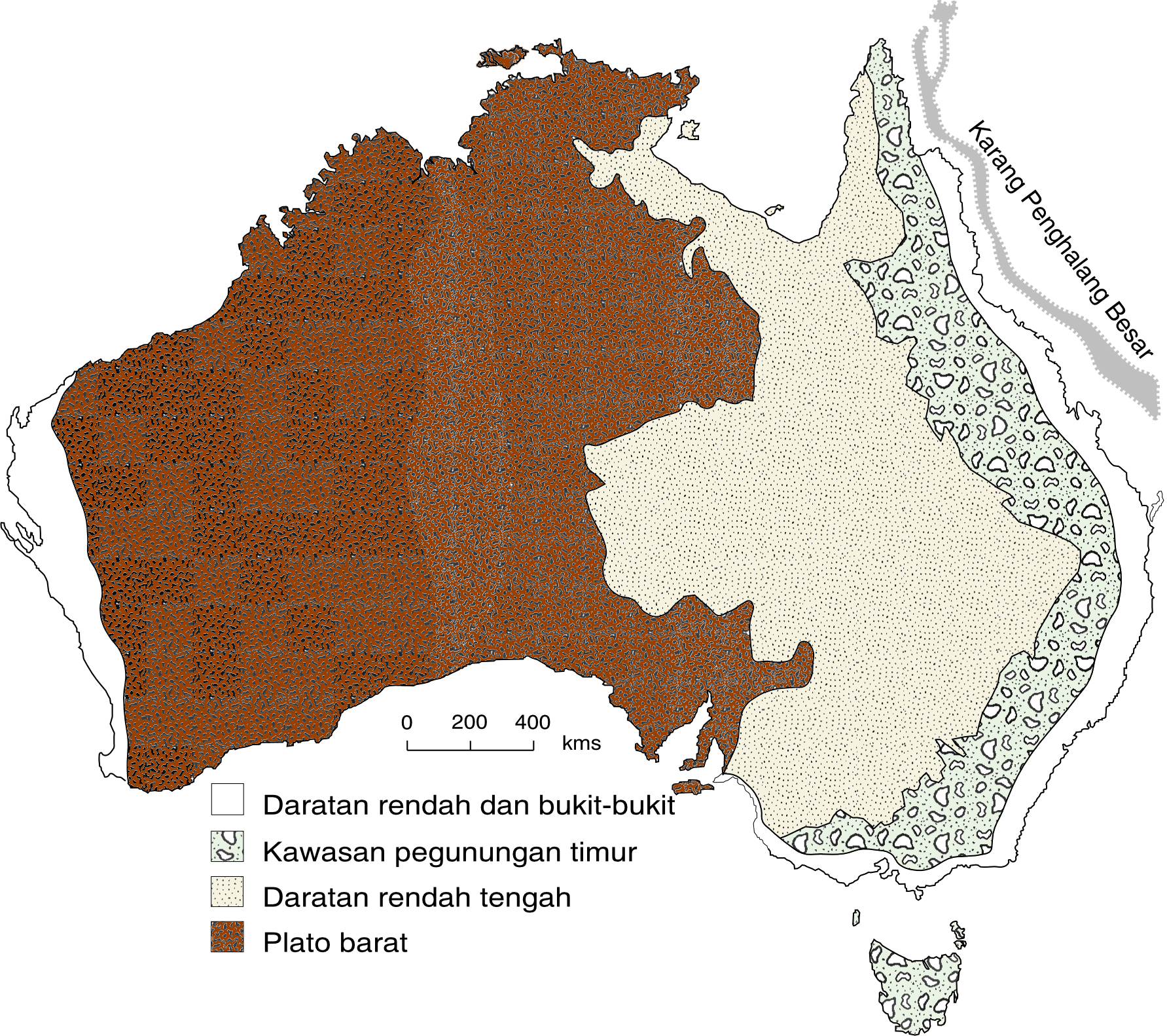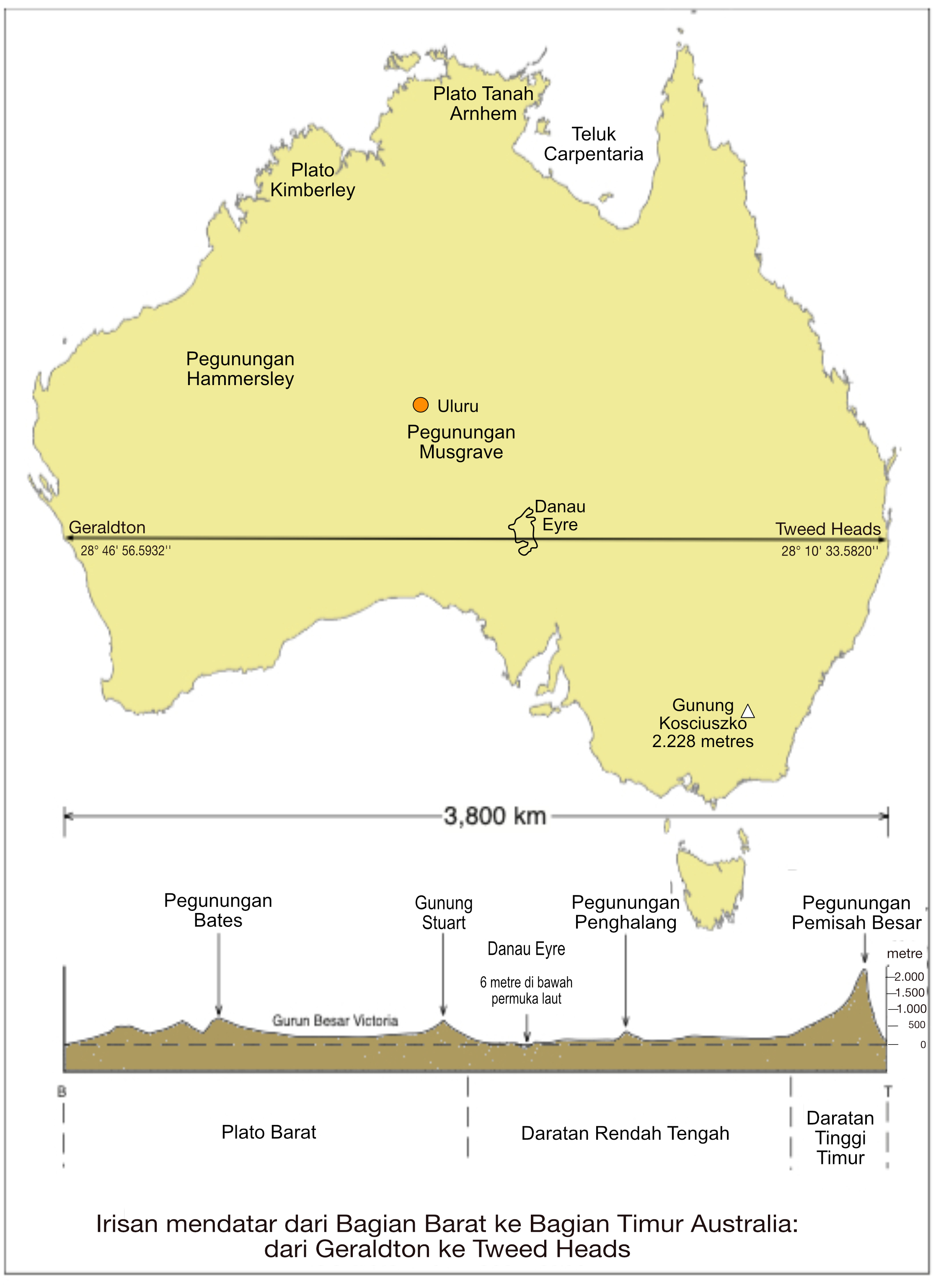 Kawasan bentang alam Australia dapat dilihat pada Gambar 1.1. Gambaran lebih jauh tentang bentang alam Australia dapat dilihat dalam rentas benua yang mulai Geraldton di bagian barat ke Tweed Heads di bagian timur. Rentas tersebut dapat dilihat dalam – Gambar 1.2.