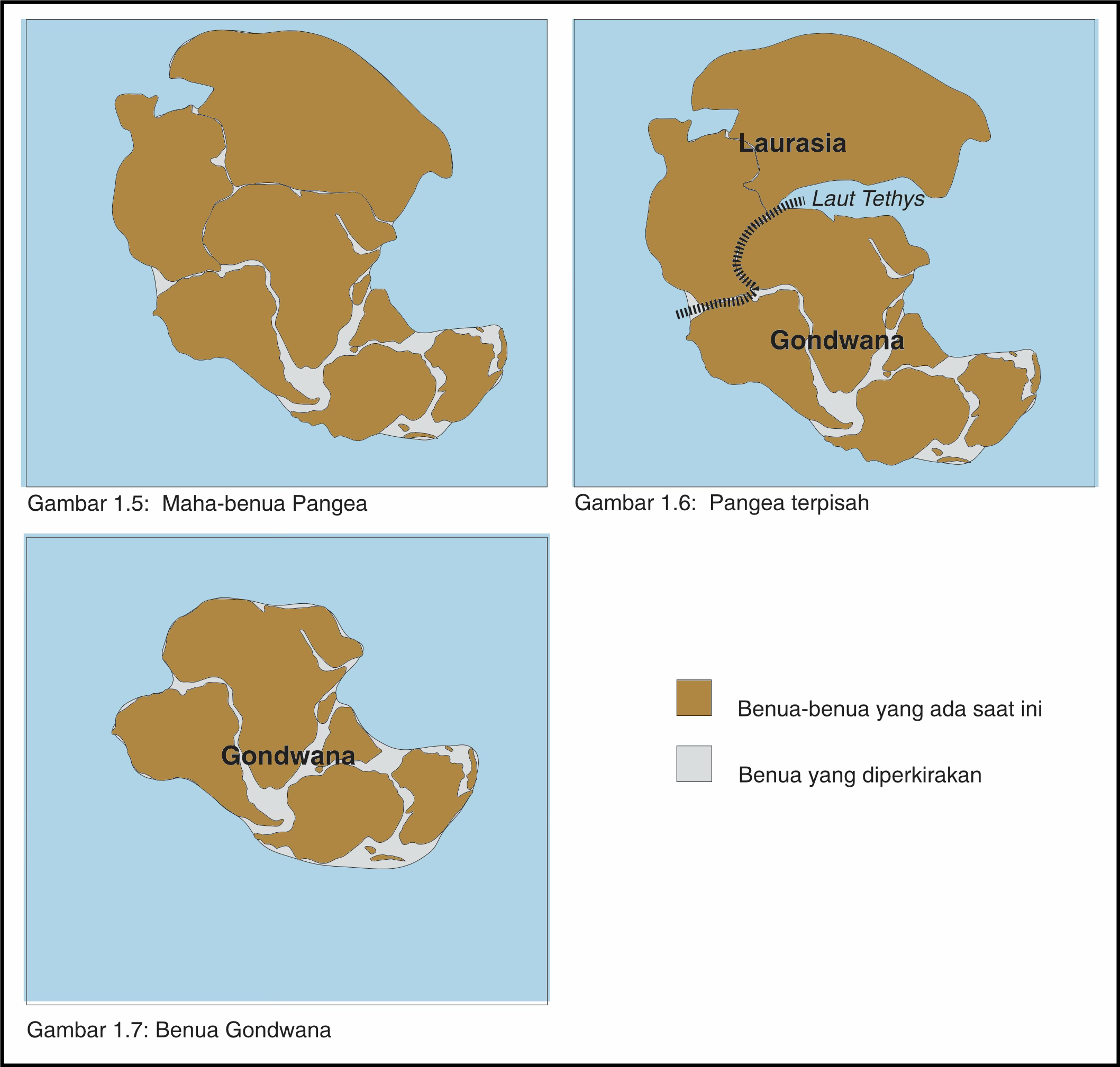 Gondwana mengapung ke arah selatan sedangkan Laurasia mengapung ke arah utara. Australia, India, Antartika, Irian Jaya, dan bagian-bagian Pulau Sulawesi merupakan bagian dari Gondwana. Diagram dalam Gambar 1.6 menunjukkan pecahnya Pangaea menjadi Laurasia dan daratan Gondwana. Dalam Gambar 1.7 daratan Gondwana tampak sebagai suatu mahabenua yang terpisah.