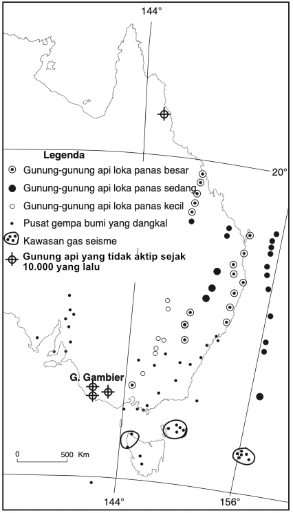 Peristiwa-peristiwa vulkanis terjadi di kawasan Australia dan berbeda dengan kegiatan vulkanis di Indonesia. Ledakan vulkanis Australia jauh lebih jarang dan tidak terlalu keras. Gunung-gunung api Australia mengeluarkan lava basal. Sebaliknya, Indonesia merupakan kawasan gunung api yang paling aktif di bumi. Indonesia mempunyai gunung-gunung api yang mudah meledak dan besar dan sering mengeluarkan lava andesit Kedua ledakan gunung api terakhir di Australia yang terjadi di Gunung Gambier dan Gunung Schank, kira-kira 5.000 tahun yang lalu, hanya menghasilkan beberapa kawah kecil dan aliran lava basal dan tidak sampai ada orang yang meninggal.