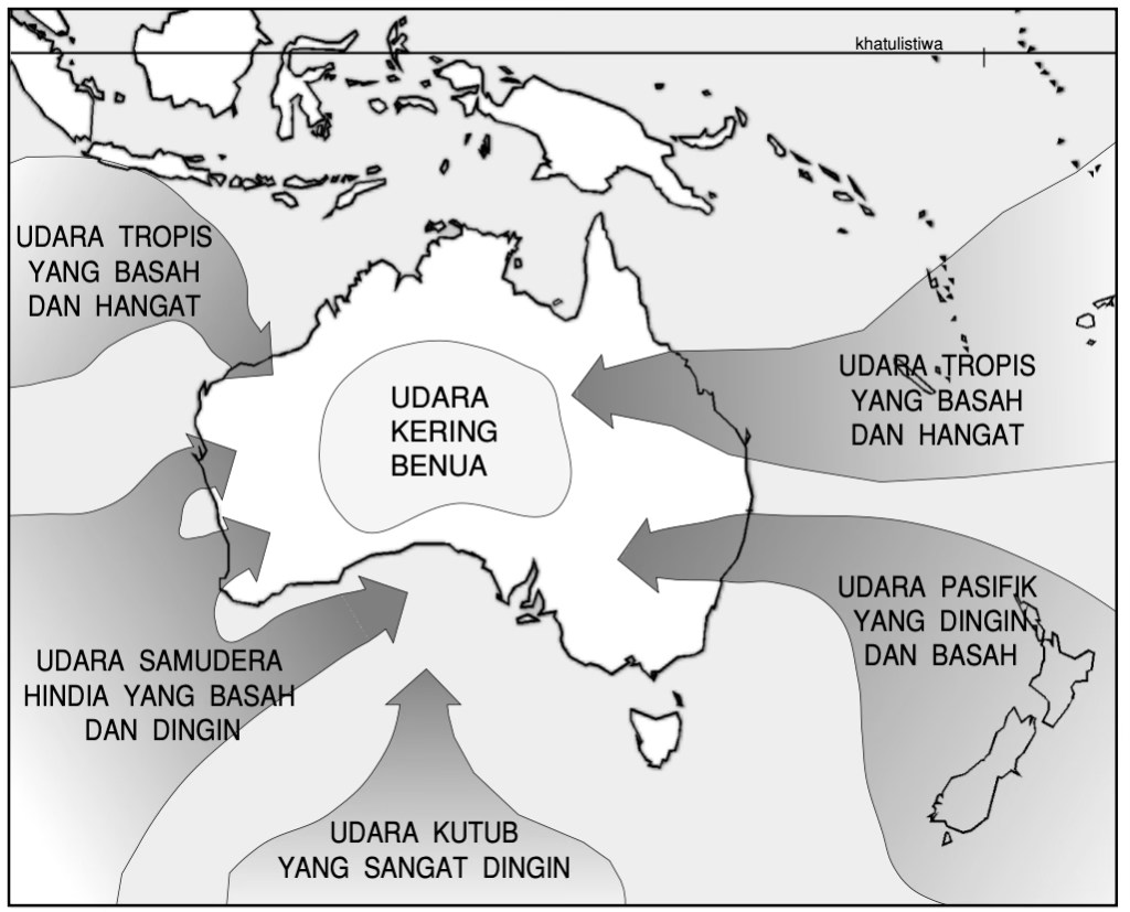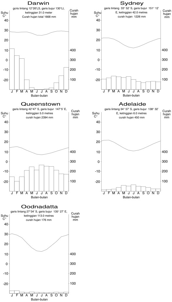 Lebih dari sepertiga benua Australia terletak di kawasan tropis dan dua pertiga sisanya terletak di kawasan subtropis dan kawasan beriklim sedang. Ini dapat dilihat pada Gambar 2.1. Suhu udara yang tertinggi adalah di kawasan beriklim tropis dan suhu tersebut semakin berkurang panasnya kalau kita bergerak ke arah selatan menuju ke kawasan beriklim sedang. Australia mempunyai bermacam-macam iklim karena adanya kawasan-kawasan ini. Bentang alam di negara ini juga mempengaruhi keadaan dan menambah keberagaman iklim tersebut.