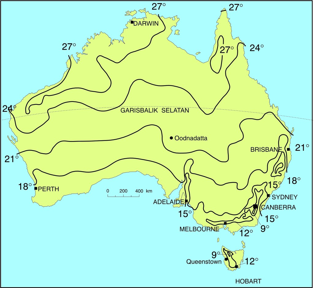 Australia betul-betul dikelilingi oleh samudera. Pada umumnya, samudera menyebabkan suhu menjadi sedang di daerah pantai sehingga tidak ada perbedaan yang besar antara suhu minimum dan suhu maksimum. Apabila menjauh dari pantai dan lebih masuk ke daratan, suhunya menjadi semakin ekstrem dan perbedaan antara suhu maksimum dan minimum menjadi lebih besar. Suhu rata-rata di Australia dapat dilihat dalam Gambar 2.3.