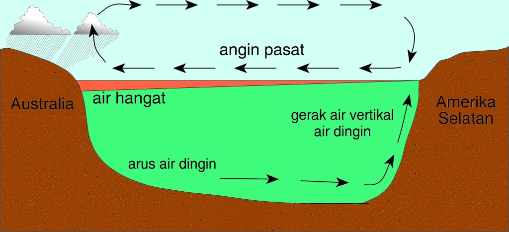 Dalam keadaan normal angin pasat berhembus dari timur melintasi Samudera Pasifik. Hal ini menyebabkan air hangat dari Pasifik tengah terdorong ke arah barat. Air hangat ini terkumpul di sepanjang garis pantai Australia sebelah utara, dan juga mengalir ke perairan Indonesia. Terbentuklah awan di atas air yang hangat ini. Awan-awan ini membawa hujan apabila bergerak di atas Australia dan Indonesia. Keadaan ini dapat dilihat dalam Gambar 2.13.