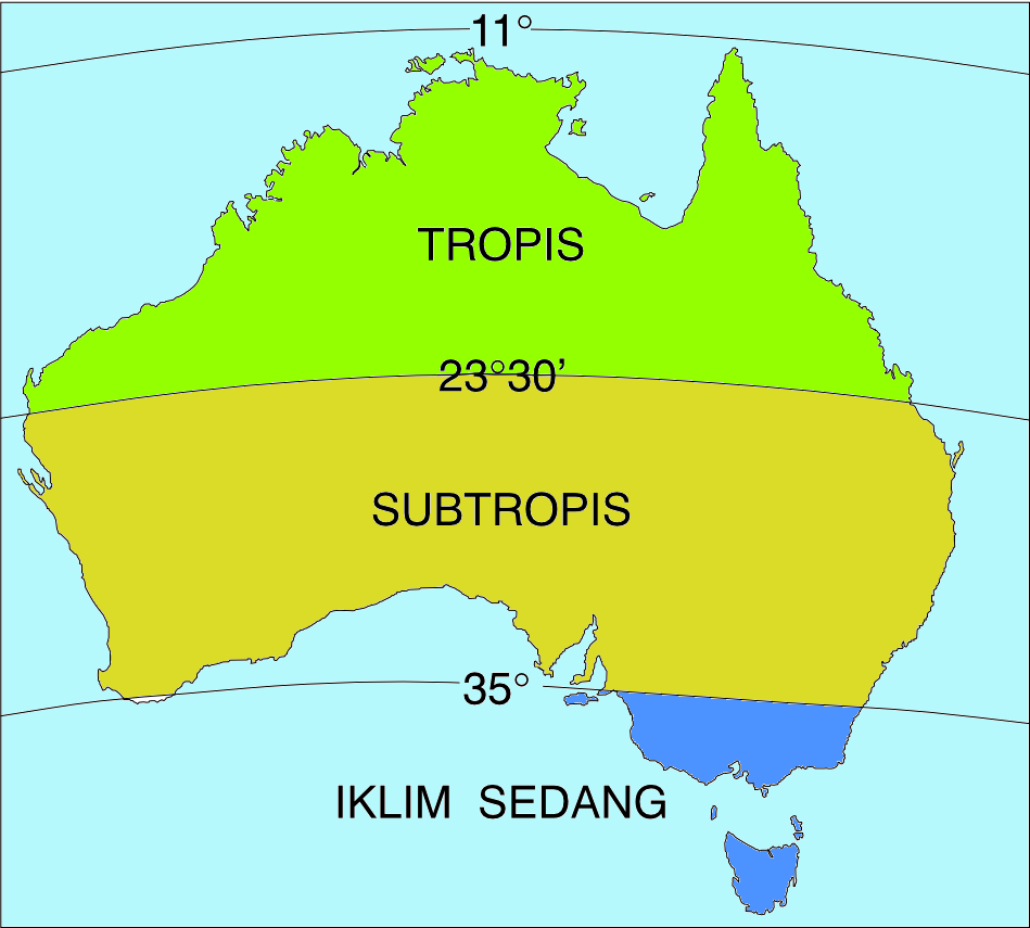 Australia membentang melintasi tiga kawasan garis lintang yang luas, yakni
