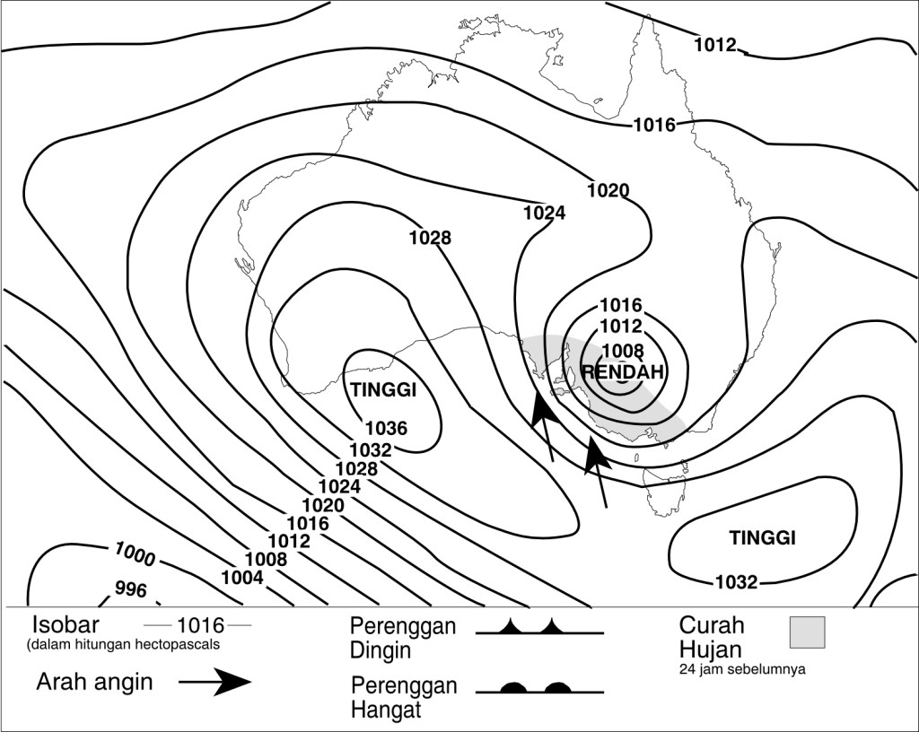 Bulan Juli adalah pertengahan musim dingin di Australia. Matahari tidak langsung berada di atas sehingga udara lebih sejuk. Udara kutub yang dingin bertiup ke arah Australia bagian selatan dari Samudera Selatan yang dingin. Udara tersebut bertiup dalam bentuk kumpulan sel-sel tekanan tinggi. Sel-sel ini bergerak melintasi benua dari arah barat ke timur. Sel tekanan tinggi membawa cuaca yang tak berawan ke daerah-daerah yang luas di Australia selama musim dingin. Sel-sel tekanan rendah juga bertiup dari barat pada kira- kira 40°LS selama musim dingin. Sel-sel ini membawa hujan. Jadi, hal ini menyebabkan banyaknya curah hujan di Australia selatan selama musim dingin. Hal ini digambarkan dalam Gambar 2.6b.