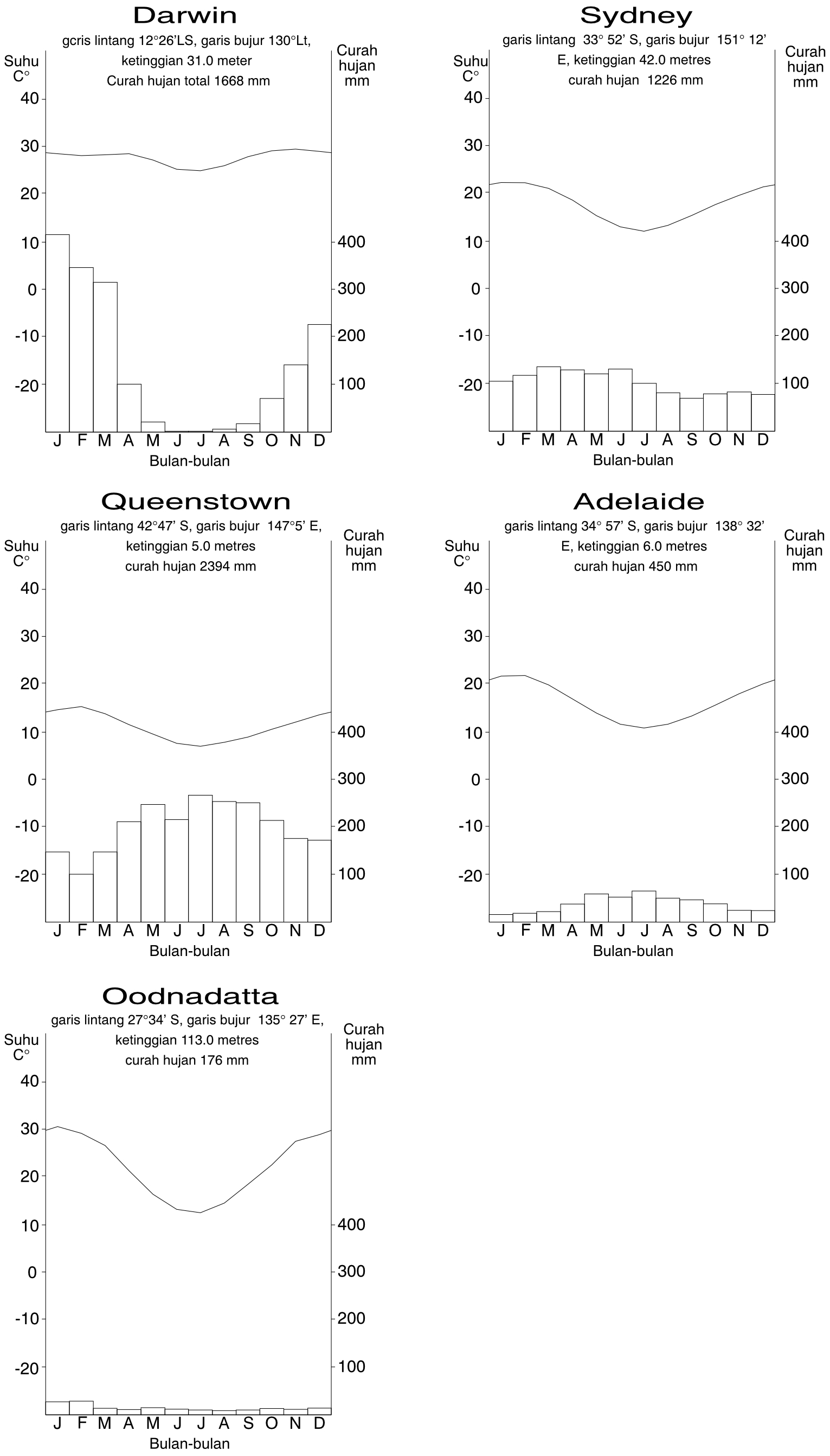 Dulunya ada hutan-hutan besar di daerah ini. Sebagian dari hutan-hutan itu masih ada. Hutan-hutan yang luas telah ditebang dan sekarang digunakan untuk pertanian, peternakan, atau dijadikan kota kecil maupun kota besar. Keterangan mengenai suhu dan curah hujan untuk kota Sydney, yakni sebuah kota beriklim lembab subtropis, dapat dilihat dalam Gambar 2.8 (di atas).