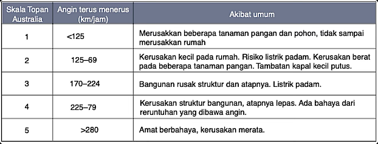Kadang-kadang sistem tekanan rendah tropis yang bergerak di atas Australia bagian utara di musim panas berubah menjadi topan tropis dengan angin yang bertiup sangat keras. Angin topan tropis dapat merusakkan bangunan, tanaman, dan satwa serta dapat mengancam hidup manusia. Pada tahun 1975, angin topan ‘Tracey’ merusakkan sebagian besar kota Darwin dan menyebabkan 49 orang meninggal serta 16 orang hilang di laut.