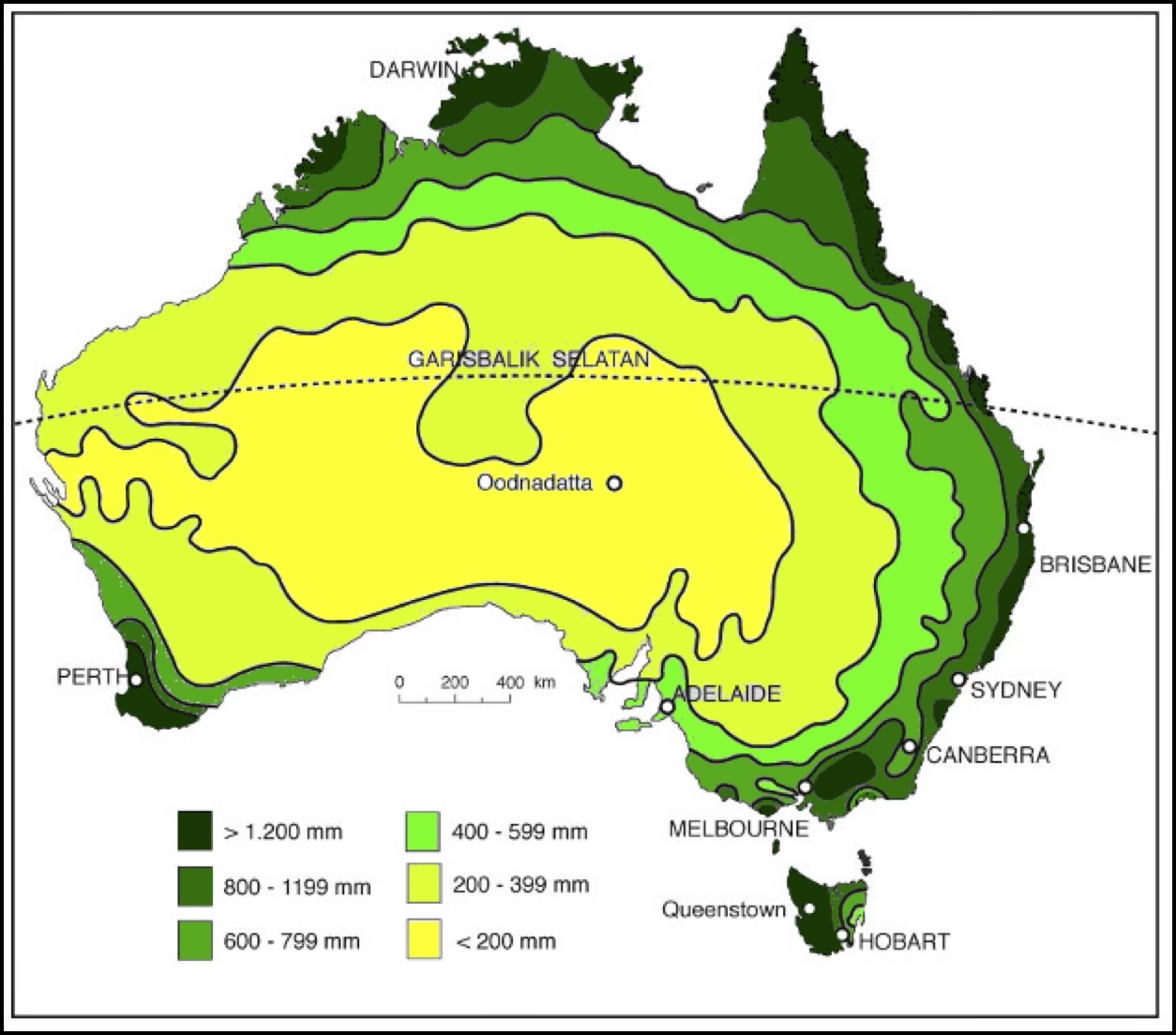 Kegersangan di AustraliaSebagian besar daerah pedalaman Australia merupakan sebuah padang pasir dengan kadar penguapan yang tinggi dan hujannya kurang dari 250 mm per tahun. Mungkin padang pasir tersebut tidak mendapat hujan sama sekali selama beberapa tahun. Didaerah tropis suhunya tinggi tetapi di daerah sebelah selatan suhunya lebih sejuk. Suhu tahunan rata-rata berkisar antara 16°C sampai dengan 27°C. Keterangan suhu dan curah hujan di kota Oodnadatta di daerah padang pasir dapat dilihat pada Gambar 2.8.