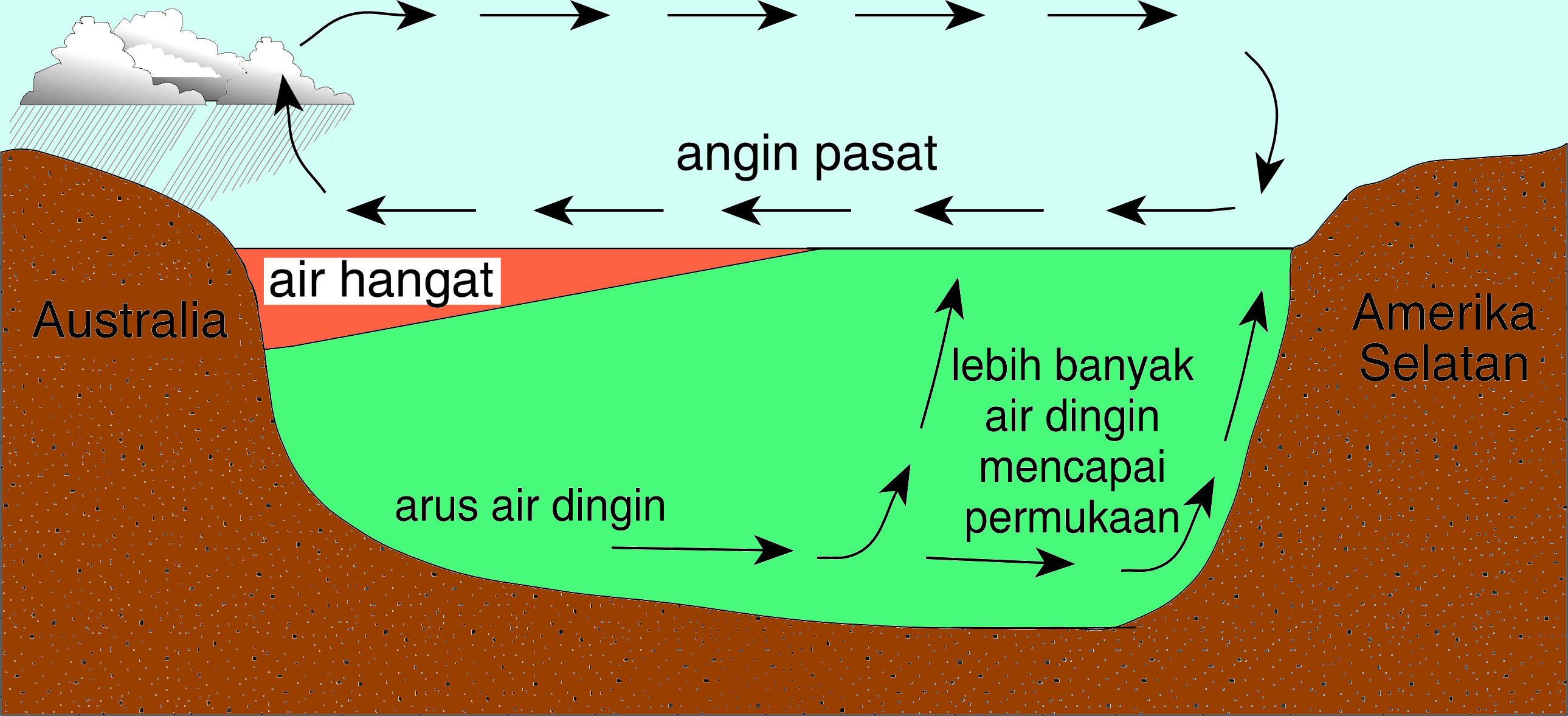 Dalam keadaan normal angin pasat berhembus dari timur melintasi Samudera Pasifik. Hal ini menyebabkan air hangat dari Pasifik tengah terdorong ke arah barat. Air hangat ini terkumpul di sepanjang garis pantai Australia sebelah utara, dan juga mengalir ke perairan Indonesia. Terbentuklah awan di atas air yang hangat ini. Awan-awan ini membawa hujan apabila bergerak di atas Australia dan Indonesia. Keadaan ini dapat dilihat dalam Gambar 2.13.