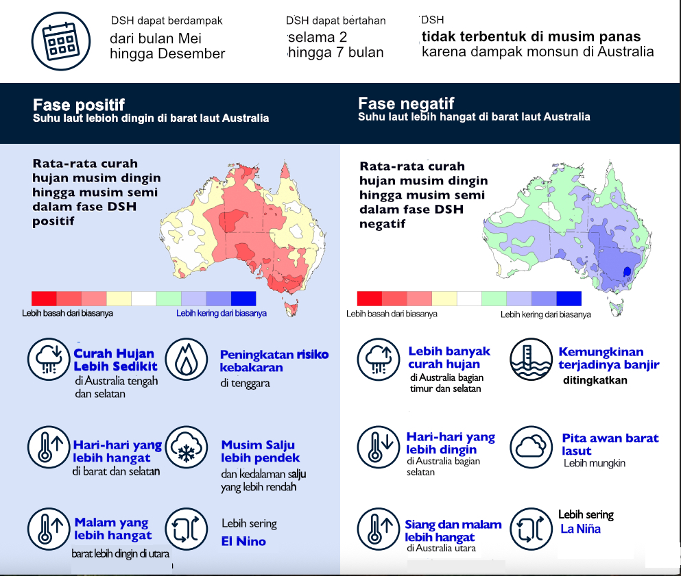 Fase Positif IOD: Ditandai dengan suhu permukaan laut yang lebih hangat dari rata-rata di Samudra Hindia bagian barat (dekat Afrika) dan suhu yang lebih dingin dari rata-rata di Samudra Hindia bagian timur (dekat Indonesia dan Australia). Hal ini menyebabkan udara lembap bergerak ke barat, mengurangi curah hujan di wilayah tenggara Asia dan Australia, serta meningkatkan curah hujan di Afrika bagian timur. Di Australia, fase positif IOD dikaitkan dengan musim semi dan awal musim panas yang lebih kering dan hangat, meningkatkan risiko kebakaran hutan.