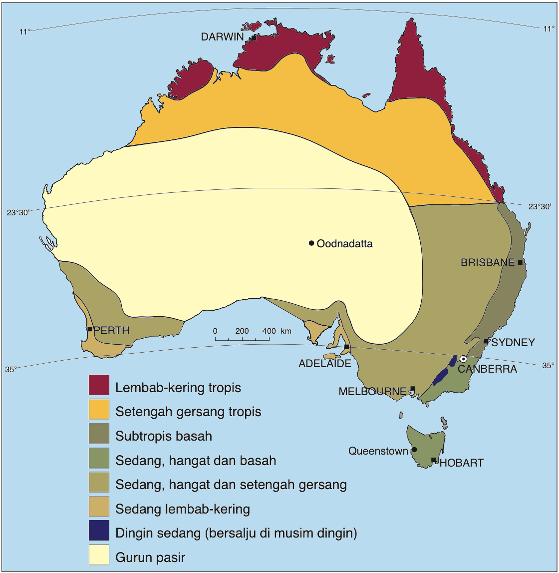 Lebih dari sepertiga benua Australia terletak di kawasan tropis dan dua pertiga sisanya terletak di kawasan subtropis dan kawasan beriklim sedang. Ini dapat dilihat pada Gambar 2.1. Suhu udara yang tertinggi adalah di kawasan beriklim tropis dan suhu tersebut semakin berkurang panasnya kalau kita bergerak ke arah selatan menuju ke kawasan beriklim sedang. Australia mempunyai bermacam-macam iklim karena adanya kawasan-kawasan ini. Bentang alam di negara ini juga mempengaruhi keadaan dan menambah keberagaman iklim tersebut.