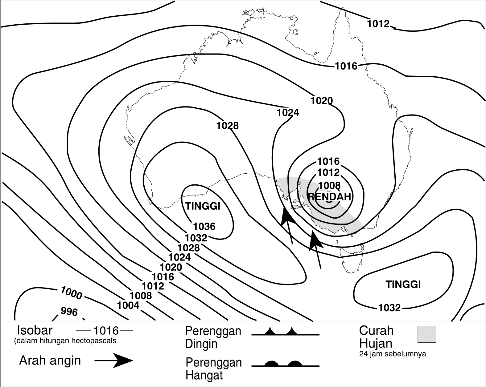 Bulan Juli adalah pertengahan musim dingin di Australia. Matahari tidak langsung berada di atas sehingga udara lebih sejuk. Udara kutub yang dingin bertiup ke arah Australia bagian selatan dari Samudera Selatan yang dingin. Udara tersebut bertiup dalam bentuk kumpulan sel-sel tekanan tinggi. Sel-sel ini bergerak melintasi benua dari arah barat ke timur. Sel tekanan tinggi membawa cuaca yang tak berawan ke daerah-daerah yang luas di Australia selama musim dingin. Sel-sel tekanan rendah juga bertiup dari barat pada kira- kira 40°LS selama musim dingin. Sel-sel ini membawa hujan. Jadi, hal ini menyebabkan banyaknya curah hujan di Australia selatan selama musim dingin. Hal ini digambarkan dalam Gambar 2.6b.